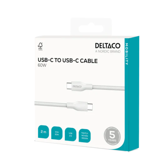 USB-C till USB-C laddningskabel, 60W, 2m, vit